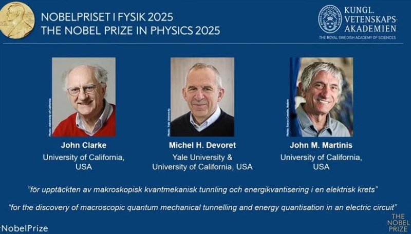 스웨덴 왕립과학원 노벨위원회는 7일 "거시적 양자역학적 터널링과 전기회로에서의 에너지 양자화를 발견한 공로"로 올해 노벨 물리학상 수상자로 존 클라크 미국 캘리포니아대 교수, 미셸 데보레 미국 캘리포니아대 및 예일대 교수, 존 마티니스 미국 캘리포니아대 교수를 결정했다고 발표했다.