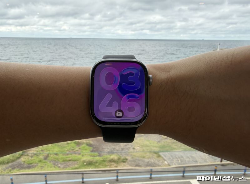 리퀴드 글래스가 적용된 애플워치 11을 착용한 모습. 사진=박성현 기자