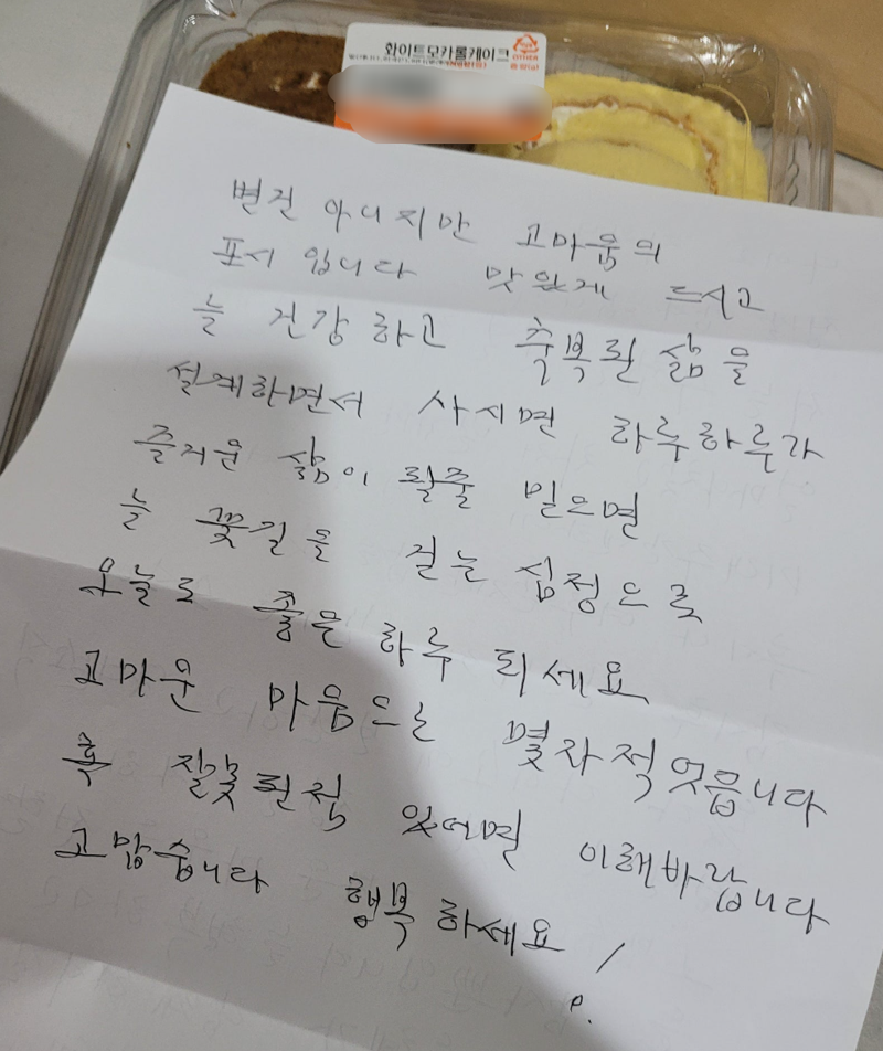 어르신이 건넨 편지에는 "별 건 아니지만 고마움의 표시입니다. 맛있게 드시고 늘 건강하고 축복된 삶을 설계하면서 사시고, 하루하루가 즐거운 삶이 될 줄 믿으면서 늘 꽃길을 걷는 심정으로 오늘도 즐거운 하루 되세요"라는 내용이 적혀 있었다.