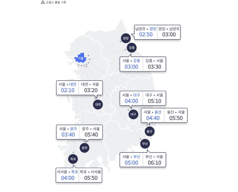 서울에서 지방까지는 △부산 5시간 △울산 4시간 40분 △강릉 3시간 △양양 2시간 50분(남양주 출발) △대전 2시간 10분 △광주 3시간 40분 △목포 4시간(서서울 출발) △대구 4시간이 걸릴 것으로 예상된다.