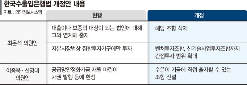 해당 개정안의 핵심은 '대출·보증과 연계해서만 출자할 수 있다'는 조항을 삭제하는 것이다. 이렇게 되면 수은은 대출이나 보증 대상이 아닌 기업에도 직접투자를 할 수 있어 자금운용이 한층 자유로워진다.