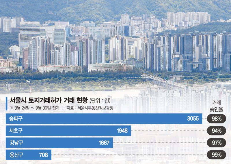이어 △강남구 1718건(23%) △용산구 711건(9%)순으로 신청 건수가 많았다. 각각 1667건(97%), 708건(99%)이 거래 허가를 받으면서 4개 자치구에서 평균 허가율은 97%를 넘었다.