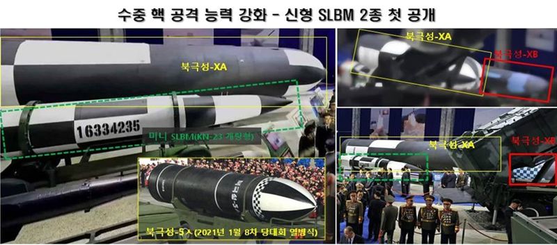 9일 국민의힘 국회 국방위원회 유용원 의원실은 북한이 이번 전시회에서 공개한 무기체계를 분석하며 북한이 신형 전략 잠수함발사탄도미사일(SLBM)을 2종을 개발하고 있다고 지적했다.