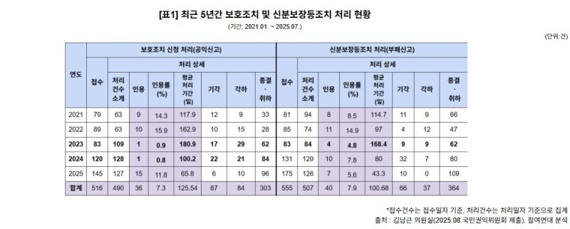 9일 참여연대가 더불어민주당 김남근 의원실을 통해 권익위로부터 받은 자료를 보면 2021년 1월부터 2025년 7월까지 권익위에는 공익신고자 보호조치 신청 516건이 접수됐다.