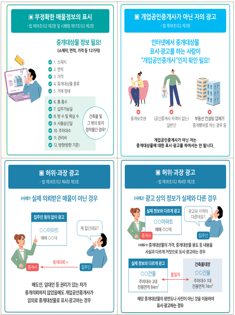 아울러 인터넷 중개대상물 불법 표시·광고뿐 아니라 집값담합, 시세교란(집값 띄우기) 등 부동산거래질서교란행위 전반을 부동산 불법행위 통합신고센터를 통해 접수·모니터링하고 있으며, 신고된 사례는 지자체와 협력해 엄정 대응해 나갈 계획이다.