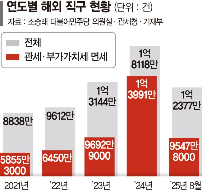 문제는 해외직구 상당수가 면세 대상이라는 점이다. 현재 개인이 직접 사용할 목적으로 온라인을 통해 구매한 해외 물품이 150달러(미국발 물품은 200달러) 이하면 수입신고 없이 관세 등을 면제받을 수 있다. 올해 1~8월 해외직구 건수와 금액은 각각 1억2377만건, 39억4600만달러(약 5조6033억원)로 집계됐다. 이 중 목록통관은 9547만8000건(77.1%), 금액은 22억8300만달러(약 3조2419억원·57.9%)에 달해 해외직구의 대부분이 과세 대상이 아니다.