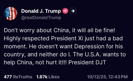 트럼프는 12일(현지 시각) 중국 측이 희토류 통제에 나선 것과 관련, "시진핑 중국 국가 주석이 잠시 실수한 것일 뿐"이라고 말했다.