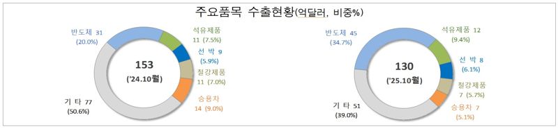 주요 수출 품목별로는 반도체(47.0%)와 석유제품(6.2%) 등이 증가한 가운데 승용차(-51.8%), 무선통신기기(-28.9%), 자동차 부품(-49.1%)은 줄었다. 반도체 수출 비중은 34.7%로 14.7%p 증가했다.