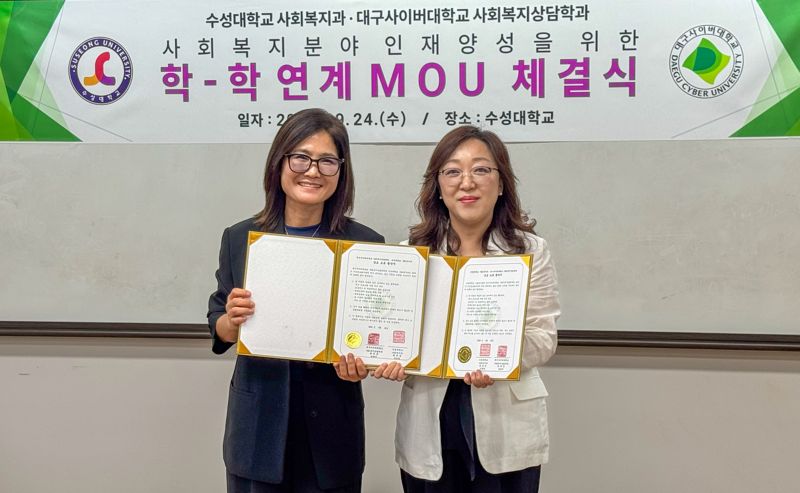 【파이낸셜뉴스 대구=김장욱 기자】대구사이버대는 지난 9월 24일 수성대 경복관 강당에서 수성대와 사회복지 분야의 전문성 강화와 지속 가능한 교육 협력체계 구축을 위한 '학-학 연계 MOU'를 체결했다고 13일 밝혔다.