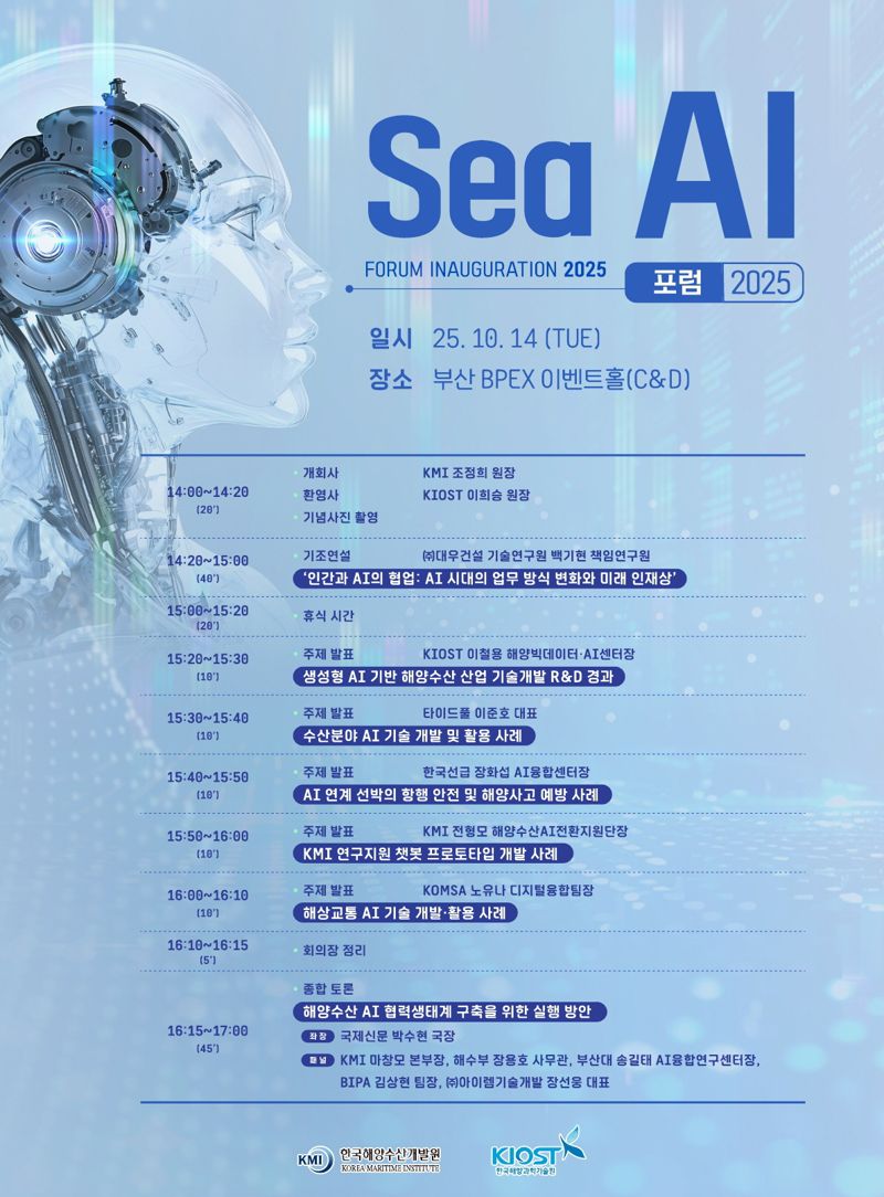 한국해양과학기술원(KIOST)과 한국해양수산개발원(KMI)은 오는 14일 부산항국제전시컨벤션센터에서 ‘2025 Sea AI 포럼’을 공동 개최한다고 13일 밝혔다.