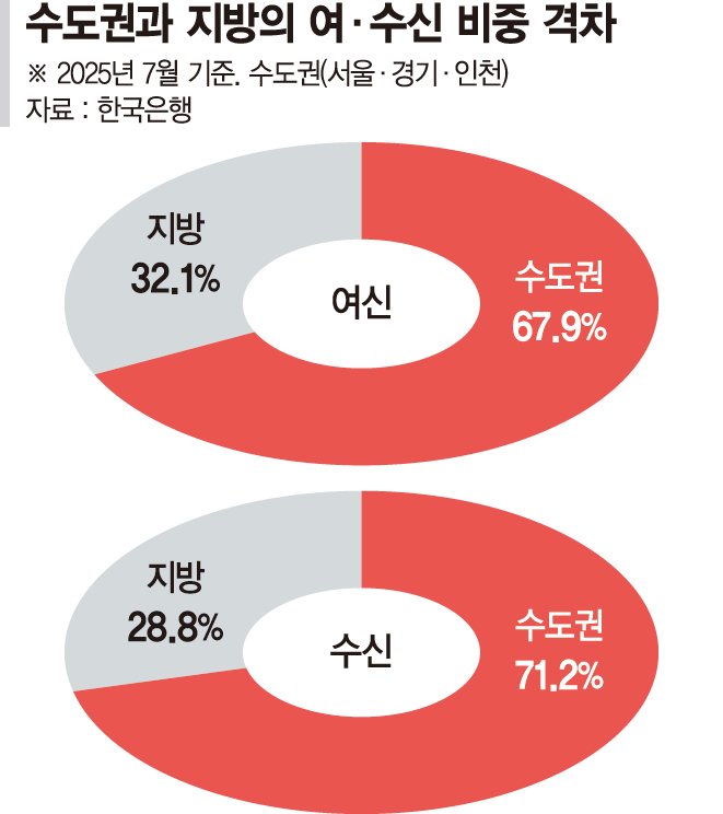 13일 한국은행에 따르면 수도권과 지방의 예금취급기관 여·수신 비중 격차는 30%p에 달한다. 올해 7월 기준 수도권의 수신 비중은 71.2%, 여신 비중은 67.9%으로 집계됐다. 지방소멸이 가속화되면서 돈의 흐름이 점점 더 수도권에 집중되는 양상이다.