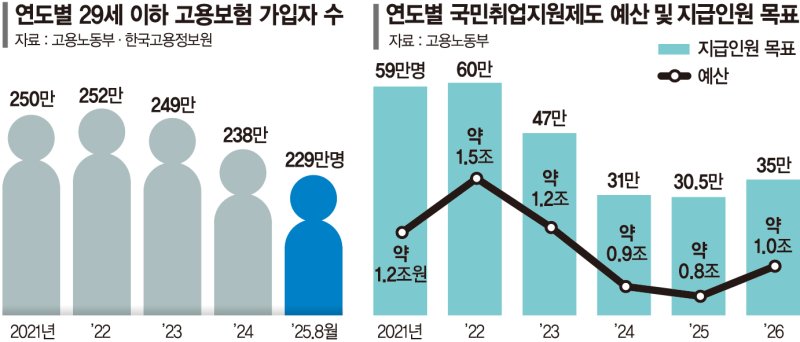 고용보험 가입자 수도 줄고 있다. 29세 이하 고용보험 가입자는 2022년을 정점으로 매년 감소세다. 올해 8월 기준 229만명으로, 2022년 같은 달보다 약 33만명 줄었다.
