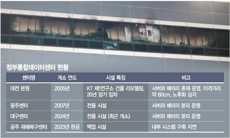특히 대전 본원은 데이터센터로는 구조적·기술적으로 부적합하다는 지적이 꾸준히 제기돼 왔다. 행정안전부는 이를 무시하고 20년 장기임차 이후 계약 연장만 반복하며 실질적인 대체방안 마련에 소극적인 태도를 보이다 화를 키웠다는 주장이 나왔다. 업계에 따르면 국정자원 대전 본원은 대전 유성구 KT 제1연구소 건물 리모델링 시설이다. 20년간 장기임차 후 올해 계약 종료를 앞두고 있었던 것으로 파악됐다. 그러나 국정자원은 크게 문제가 없다고 보고 사용기간을 연장, 오는 2030년 8월까지 사용키로 최근 계약을 갱신했다.