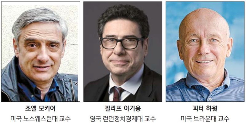 올해 노벨경제학상의 영예는 기술의 진보와 혁신이 지속가능한 성장을 이끈다는 원리를 정립한 경제학자 3인에게 돌아갔다. 13일(현지시간) 스웨덴 왕립과학원은 조엘 모키어 미국 노스웨스턴대 교수(79), 피터 하윗 미국 브라운대 교수(79), 필리프 아기옹 영국 런던정치경제대 교수(69)를 노벨경제학상 수상자로 결정했다고 밝혔다.