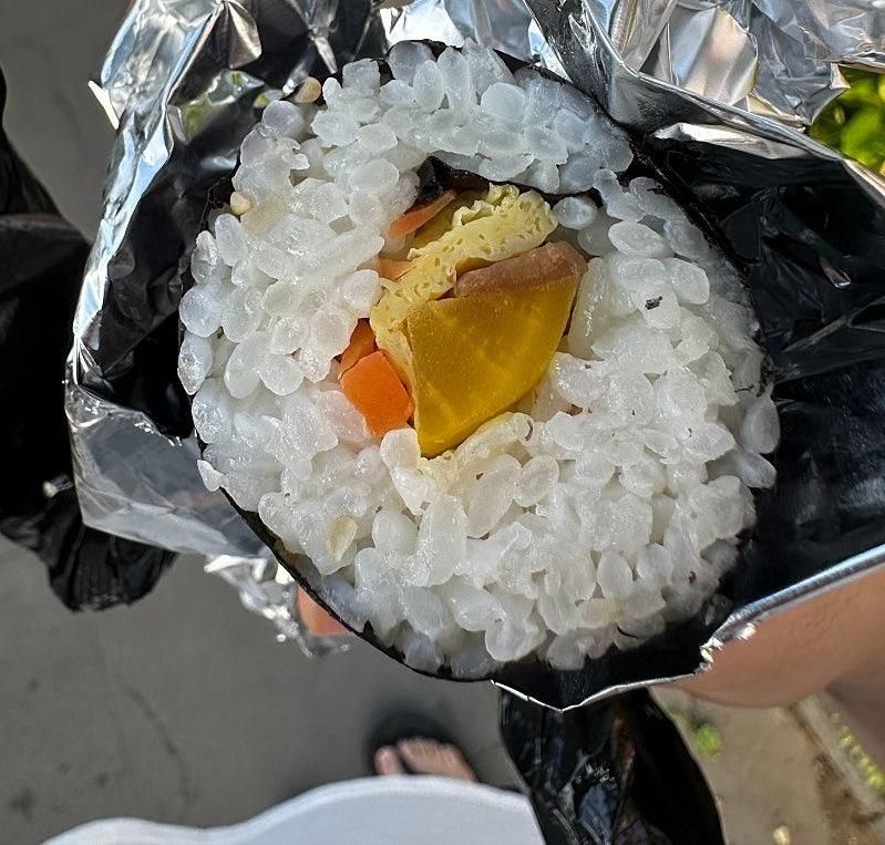 김밥 속재료로 단무지와 계란, 당근 몇 조각만 보일 뿐 밥이 김밥의 대부분을 차지할 정도다.