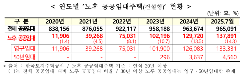 14일 국회 국토교통위원회 소속 더불어민주당 안태준 의원(경기 광주시을)이 한국토지주택공사(LH)에서 제출받은 자료에 따르면, 올해 7월 기준 30년 이상 된 건설형 공공임대주택은 13만7891가구로 2020년 1만1906가구에 비해 11배 넘게 증가했다. 전체 공공임대 가운데 노후 공공임대 비율도 같은 기간 1.4%에서 14.3%로 12.9%p 상승했다.