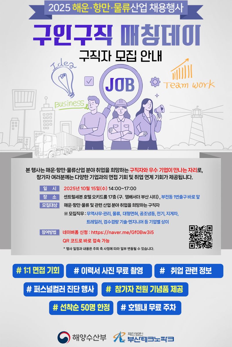 이번 일자리 행사에는 해운, 항만, 물류 분야 우수기업 15개사가 참여해 현장에서 채용면접을 진행한다.