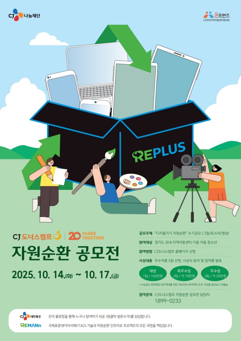 또한 CJ대한통운은 CJ나눔재단과 연계해 경기도 지역아동센터를 대상으로 ‘디지털기기 자원순환’을 주제로 한 공모전을 개최한다. 올해 20주년을 맞은 나눔 플랫폼 CJ도너스캠프를 통해 진행되는 이번 공모전은 그림, 포스터, 영상 등 다양한 분야로 참여할 수 있으며, 수익금은 노트북 지원 등 취약지역 디지털 격차 해소에 사용된다.