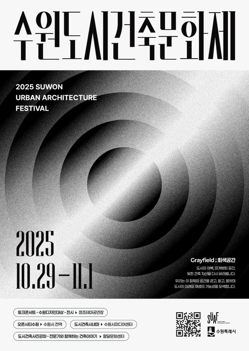 올해 수원도시건축문화제의 주제는 'Grayfield; 회색공간'으로, 미개방된 공간과 잊힌 건축 자산을 전문가와 함께 다시 바라보며 도시의 미래와 재생의 방향을 알아보는 행사다.