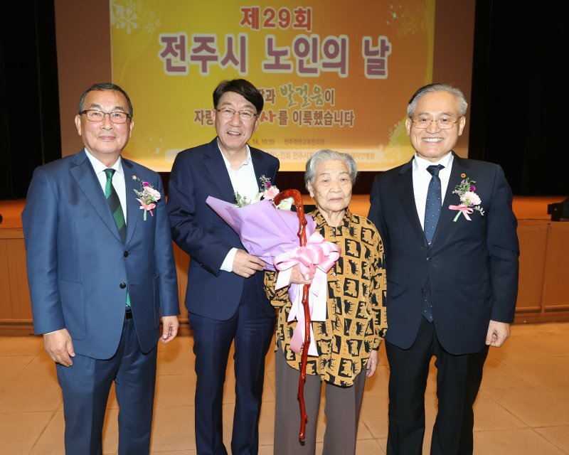 특히 이날 우 시장은 올해 100세를 맞은 김옥순 어르신(덕진동)에게 무병장수의 상징인 장수 지팡이를 전달했다. 홍성언 지회장은 축하의 꽃다발을 전했다.