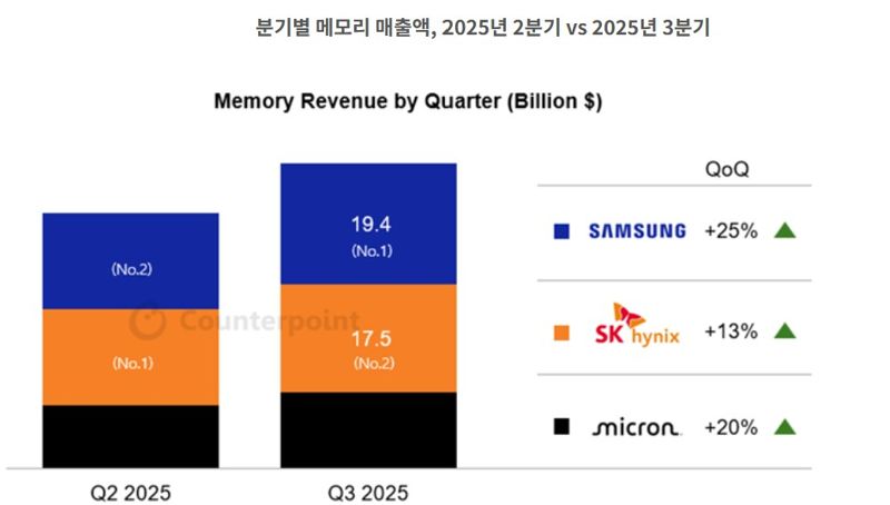 14일 글로벌 시장조사업체 카운터포인트리서치에 따르면 삼성전자는 3·4분기 D램과 낸드 플래시를 포함한 전체 메모리 시장에서 194억 달러(약 27조6700억원)의 매출을 기록하고, SK하이닉스는 175억 달러(약 24조9600억원)을 달성했다. 삼성전자의 메모리 매출은 전분기 대비 25% 상승하며, 그동안의 부진을 만회했다.