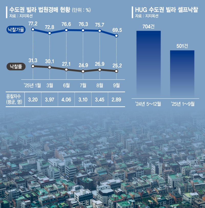 지지옥션에 따르면 수도권 빌라 낙찰가율은 8월 75.70%에서 9월 69.50%로 하락하며 70%대가 무너졌다. 이뿐만이 아니다. 응찰자도 올 1~8월에는 평균 3.75명이었으나 9월에는 2.89명으로 추락했다.
