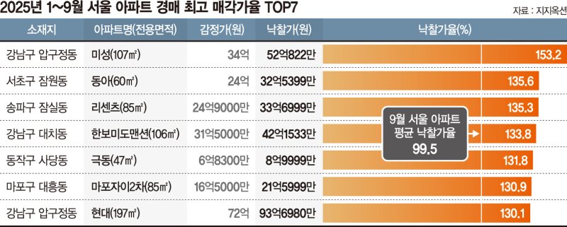 일반적으로 경매 감정가는 시장가 보다 낮은데다 유찰 시 20~30%씩 하락하기 때문에 감정가의 100% 수준에 매각되면 '고가 낙찰'로 평가된다. 지지옥션에 따르면 지난 9월 서울 아파트 평균 낙찰가율은 99.5%로, 2022년 6월(110%) 이후 3년 만에 가장 높은 수준을 기록했다. 감정가의 130% 수준에 낙찰된 아파트는 전국에서 11건이 나왔는데 이 중 7건이 서울에 몰렸다. 특히 강남3구에서만 5건이 거래되며 대부분을 차지했다.