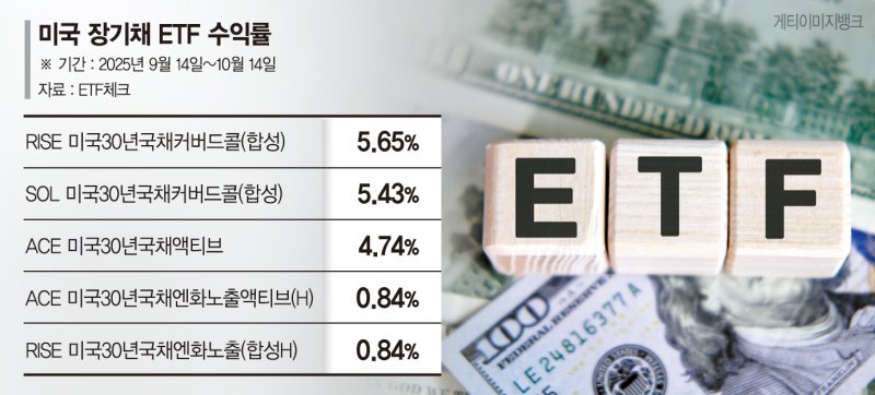 14일 코스콤 ETF체크에 따르면 최근 1개월 간(9월14~10월14일) 국내 상장 채권형 ETF 수익률 최상위권에는 미국 장기채 ETF가 나란히 이름을 올렸다. 'RISE 미국30년국채커버드콜(합성)'이 5.65% 상승해 1위를 기록했고, 뒤이어 'SOL 미국30년국채커버드콜(합성)'이 5.43% 수익률을 올렸다. △ACE 미국30년국채액티브 4.74% △PLUS 미국채30년액티브 4.04% 순으로 이름을 올렸다.