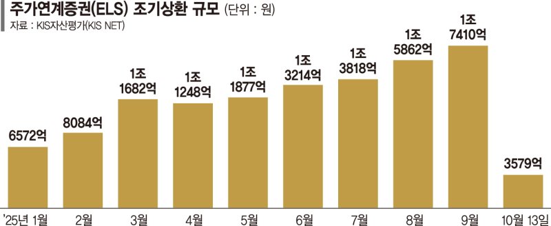 14일 금융투자업계와 KIS자산평가에 따르면 지난달 ELS의 조기 상환 규모는 1조7410억원으로 올들어 월 기준 연중 최고치를 찍었다. 지난해 동월 조기상환규모 1조1696억원과 비교해도 5000억원 넘게 증가한 규모다.