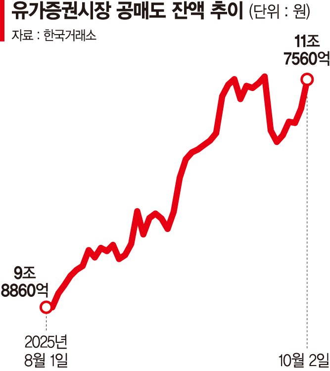 14일 한국거래소에 따르면 지난 2일 기준 유가증권시장 공매도 잔액은 11조7560억원으로 집계됐다. 지난달 25일 11조2510억원 수준이던 공매도 잔액이 불과 4거래일 만에 5000억원 넘게 늘었다. 기간을 더 넓혀 보면 공매도 잔액은 꾸준히 증가하고 있다.