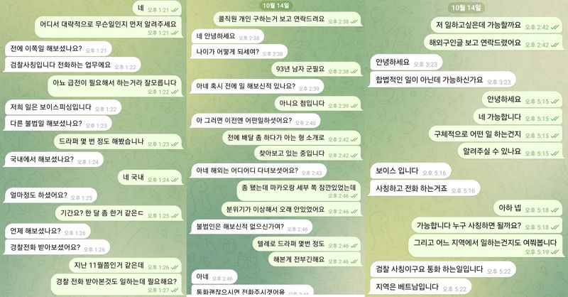 최근 온라인에서 성행하는 '해외 고수익 아르바이트(알바)' 모집자는 텔레그램으로 진행된 첫 대화에서 '보이스피싱'이라는 단어를 스스럼없이 꺼냈다. 해외에서 진행되는 텔레마케팅(TM)으로, 간단한 고객 응대만 하면 된다고 적어 놓은 홍보글 내용과는 완전히 달랐다. 그는 마치 경력자를 선호하는 면접관처럼 "다른 불법 일 해본 적 있냐"며 범죄 이력을 캐묻기도 했다.