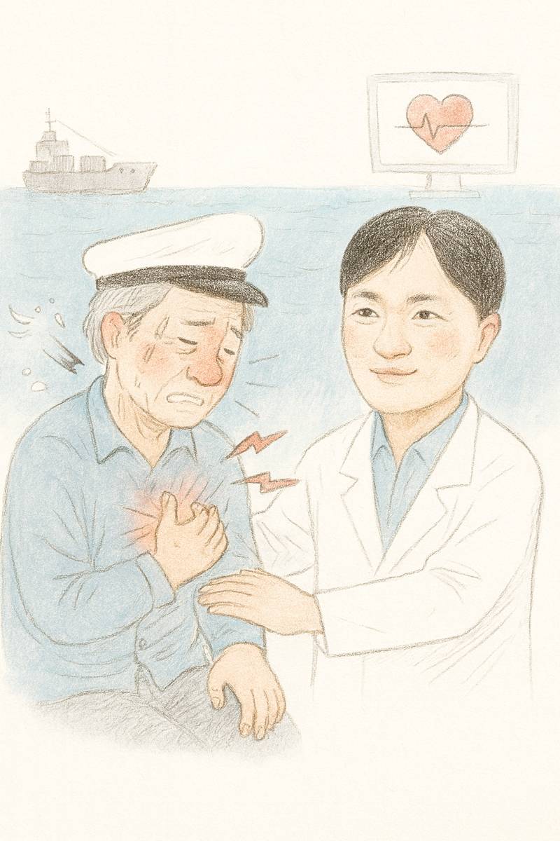 선상에서 심한 흉통이나 명치통이 있으면 육지로 이동하여 심장전문의가 있는 곳에서 진료와 치료를 받아야 한다고 것이다.