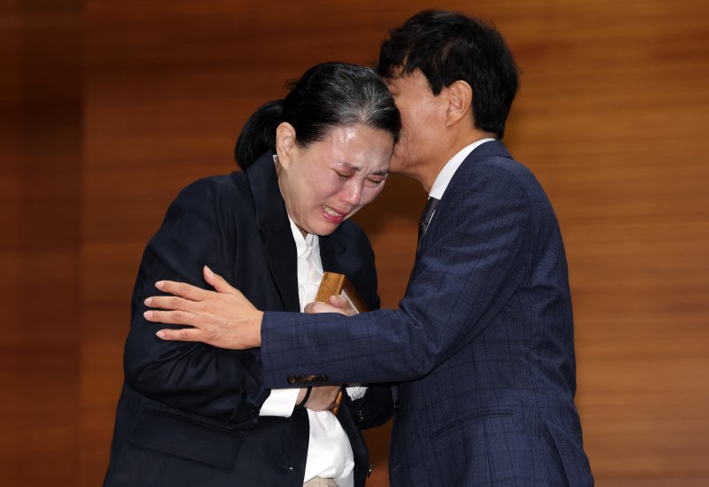 이날 기자회견 전에는 오요안나를 추모하며 묵념의 시간을 가졌다. 안 사장과 고인 어머니 장연미씨는 합의서에 서명했다. 장씨는 고인 명예사원증을 받고 눈물을 쏟았다. 안 사장은 장씨와 포옹하며 위로를 건넸다.
