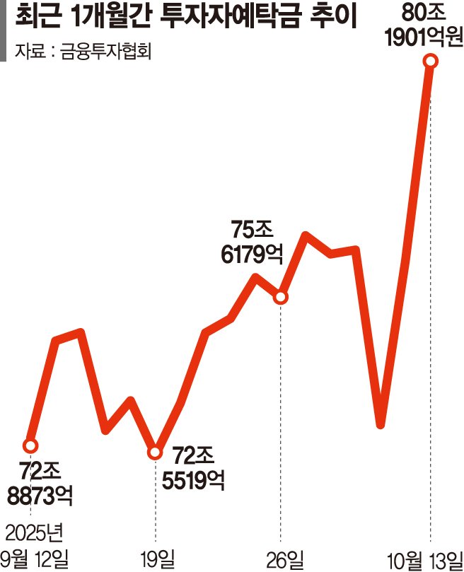 15일 금융투자협회에 따르면 투자자예탁금은 지난 13일 80조1901억원을 기록해 지난 2021년 5월 3일 77조9018억원 이후 4년 5개월 만에 역대 최고치를 경신했다. 지난 10일 76조3225억원과 비교해 1거래일 만에 4조원가량이 늘었으며, 지난달 10일 70조원대로 올라서고 한 달 사이에 약 10조원이 증가했다.