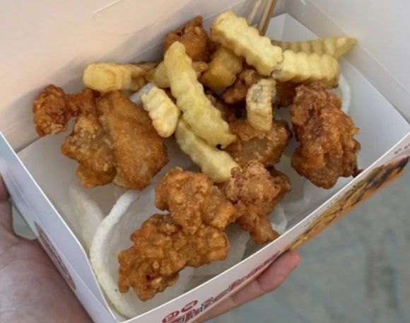 그가 공개한 사진을 보면 마른 닭강정 몇 조각과 감자튀김, 알새우칩이 손바닥 만한 용기에 담겨있었다.