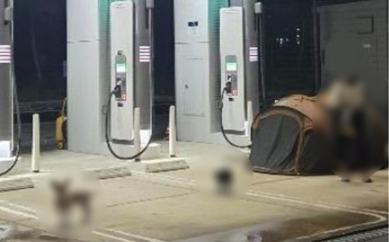 공개된 사진에는 전기차 충전소에 텐트가 설치돼 있고 바로 옆에 차 한 대가 주차된 모습이 담겼다.