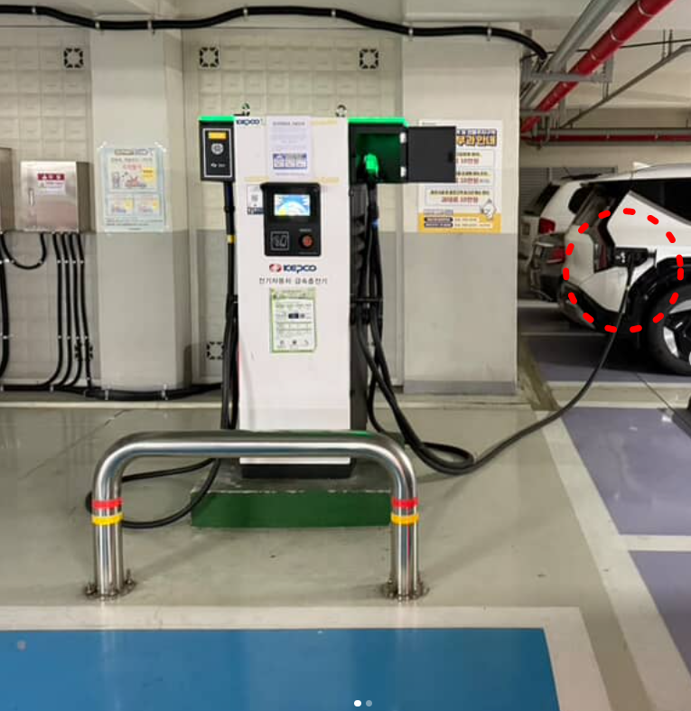 언뜻 보면 아무 문제 없어 보이는 이 사진을 자세히 들여다 보면 이상한 점이 있다. 전기차 충전소의 충전 호스가 길게 늘어져 있고 일반 주차 구역에 세워둔 차량에 꽂혀 있었다.