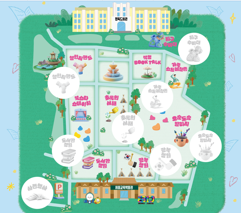 축제는 정독도서관 야외정원을 총 8개 구역으로 나눠 운영된다. 가족이 함께 공연과 시상식을 즐길 수 있는 '북스타 스테이지'를 비롯해, 도서관별 체험 부스가 마련된 '오순도순 빌리지', 광복 80주년을 기념하는 '광복 정원' 등이 눈길을 끈다. 또한 생태전환 교육을 담은 '초록의 서재'와 '지구 수비대', 휴식과 독서를 겸할 수 있는 '책멍 북 톡 힐링존'도 운영된다.