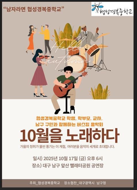 '10월을 노래하다'를 주제로 열리는 음악회는 협성경복중 학생들이 밴드 등을 꾸려 주민과 교사, 학생들에게 버스킹 공연을 선보이는 축제의 장으로 펼쳐진다.