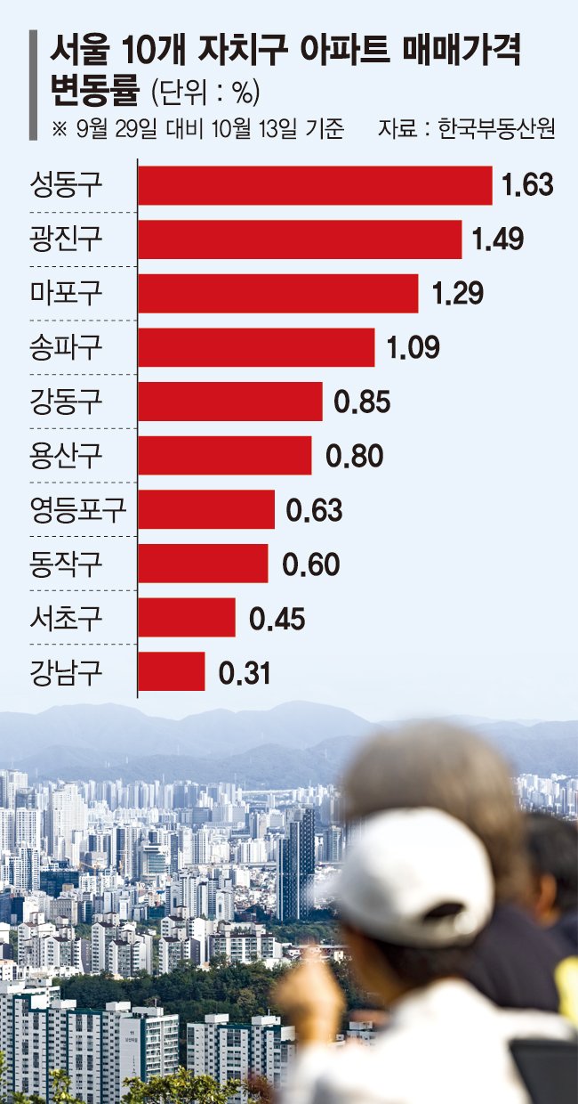 16일 한국부동산원이 발표한 '10월 2주(13일 기준) 주간 아파트가격 동향'에 따르면 서울 아파트 매매가격은 9월 5주(29일 기준, 0.27%) 이후 2주간 0.54% 뛰었다. 자치구별로는 성동구가 1.63%로 가장 높은 상승률을 기록했다.