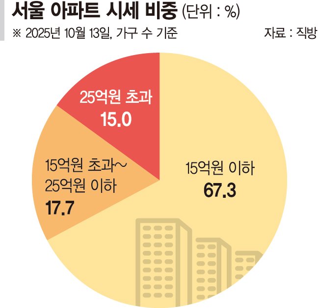 16일 파이낸셜뉴스가 직방에 의뢰해 분석한 결과 서울 아파트(임대 제외) 시세 15억원 초과 비중은 32.7%로 조사됐다. 10월 13일 시세 기준으로 4656개 단지를 대상으로 이뤄졌다.