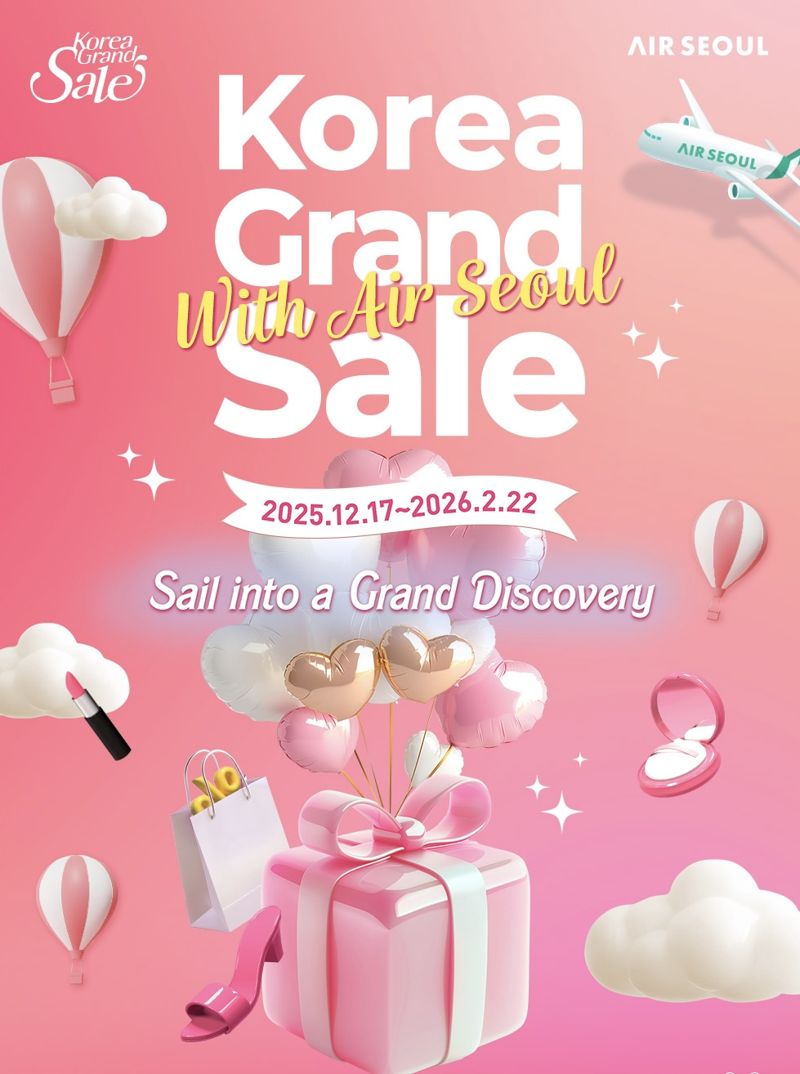 [파이낸셜뉴스] 에어서울은 재단법인 한국방문의해위원회가 주관하는 글로벌 쇼핑관광축제 ‘코리아 그랜드 세일’에 참여한다고 17일 밝혔다. 오는 2025년 12월 17일부터 2026년 2월 22일까지 진행되는 행사다. 에어서울은 지난 16일부터 프로모션을 통해 외국인 관광객을 위한 혜택을 제공하기 시작했다.