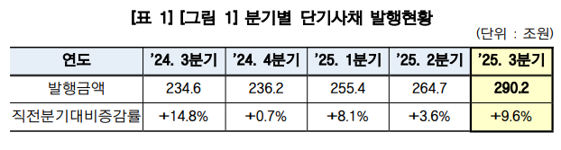 유형별로는 일반 단기사채가 203조6000억원이 발행돼 전년 동기(175.7조원) 대비 15.9% 증가했고 유동화 단기사채는 86조6000억원이 발행돼 전년 동기(58.9조원) 대비 47%) 증가한 것으로 집계됐다.