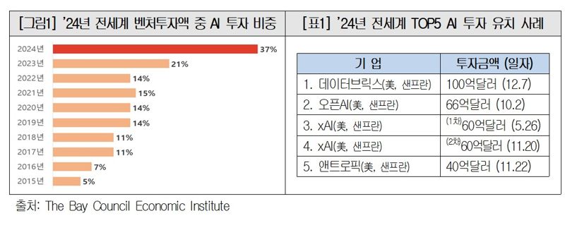 첫 번째 발제를 맡은 미국 샌프란시스코 소재 경제연구소인 베이카운슬경제연구소의 션 란돌프 시니어 디렉터는 "지난해 전 세계 벤처 투자액 중 AI 분야가 37%를 차지하며 폭발적으로 성장 중이며, 특히 미국 내 AI 투자의 76%가 실리콘밸리를 포함한 샌프란시스코 지역에 집중됐다"며 "지난해 전 세계 AI 투자 유치액 기준 상위 5위를 기록한 기업들도 모두 이 지역에 본사를 두고 있다"고 강조했다.