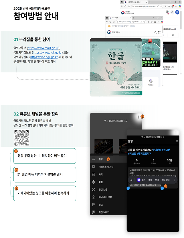 투표는 기관 누리집과 홍보 영상 내 링크를 통해 참여할 수 있으며, 남극의 대상 지역을 3차원 입체지도를 활용해 편리하게 확인할 수 있다. 각 지역의 지리적 특성과 지명 유래 등 상세 정보도 함께 제공된다.