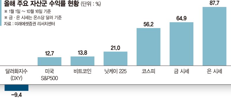 미국 재정적자 확대와 각국 중앙은행의 금리인하로 법정화폐 가치가 흔들리면서 금, 주식, 가상자산이 동시에 오르는 '에브리싱 랠리'가 가속화되고 있다. 금 가격은 연일 급등하며 사상 최고치를 경신하고 있고, 내년 코스피 상단은 4300까지 전망됐다. 이에 증권가 전문가들은 해외매출 비중이 높은 수출주 중심으로 포트폴리오를 재편해야 한다고 조언한다.