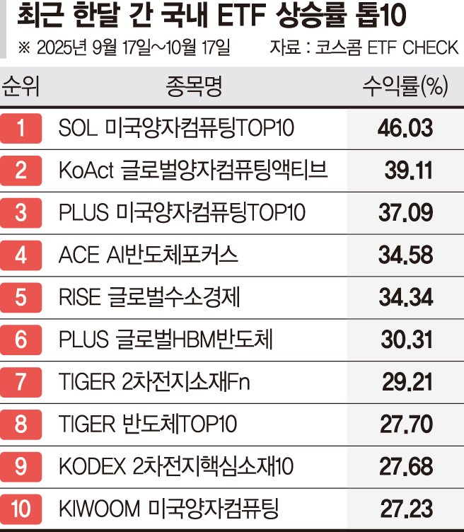 최근 한 달간 ETF 시장의 수익률 상위권은 '양자컴퓨팅' 테마가 독식했다. 상위 10개 ETF 중 4개가 미국 양자컴퓨팅 관련 상품으로, 30~40%대의 상승률을 기록했다. 전문가들은 인공지능(AI) 호황 속에 차세대 기술로 부상했다고 평가하면서도, 최근 불거진 금융 리스크로 인한 단기 변동성에는 주의해야한다고 입을 모았다.