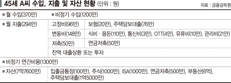 45세 A씨 월 수입은 370만원이다. 연간 비정기 수입으로 1200만원이 들어온다. 월 지출은 294만원이다. 고정비가 보험(20만원), 주택담보대출(76만원) 등 96만원이다. 변동비는 식비·용돈(110만원), 통신비(3만원), OTT(4만원), 유류비(10만원), 관리비(21만원) 등 148만원이다. 저축은 연금저축 50만원씩 하고 있다. 남은 자금은 대출 상환이나 투자에 사용한다. 자산은 입출금통장(100만원), 주식(1000만원), ISA(1000만원), 연금저축(500만원), 부동산(6억), 주택담보대출(1억5000만원) 상당이다.