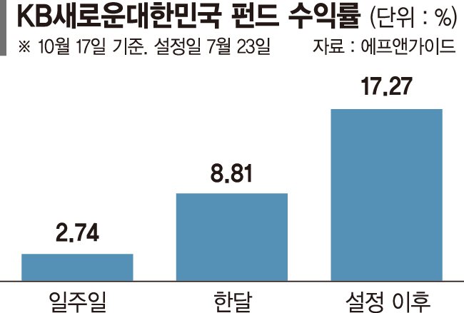 19일 금융정보업체 에프앤가이드에 따르면 지난 17일 기준 'KB새로운대한민국 펀드'의 최근 일주일 수익률은 2.74% 수준이다.