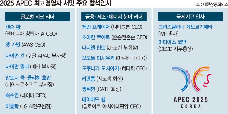 젠슨 황 엔비디아 창립자 겸 최고경영자(CEO)와 맷 가먼 AWS CEO, 제인 프레이저 씨티그룹 CEO, 호아킨 두아토 존슨앤존슨 CEO, 도쿠나가 도시아키 히타치 CEO, 리판룽 시노켐 회장, 쩡위췬 CATL 회장 등 아시아·태평양 지역을 대표하는 기업인들이 오는 28일 경주에 총집결한다.